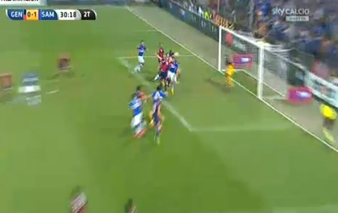 La Sampdoria passa in vantaggio grazie ad una punizione battuta da Gabbiadini sull'out di destra. Il pallone molto tagliato finisce in porta dopo essere stato leggermente toccato dal difensore rossoblu De Maio.