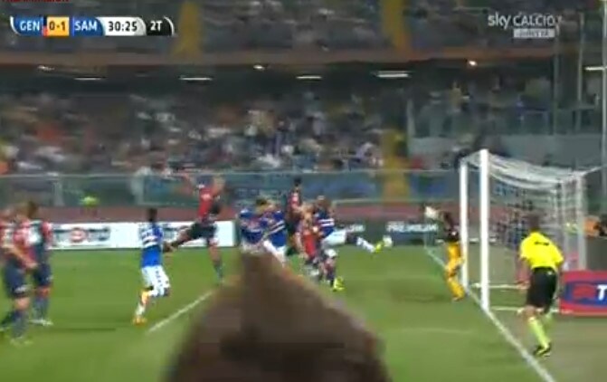 La Sampdoria passa in vantaggio grazie ad una punizione battuta da Gabbiadini sull'out di destra. Il pallone molto tagliato finisce in porta dopo essere stato leggermente toccato dal difensore rossoblu De Maio.