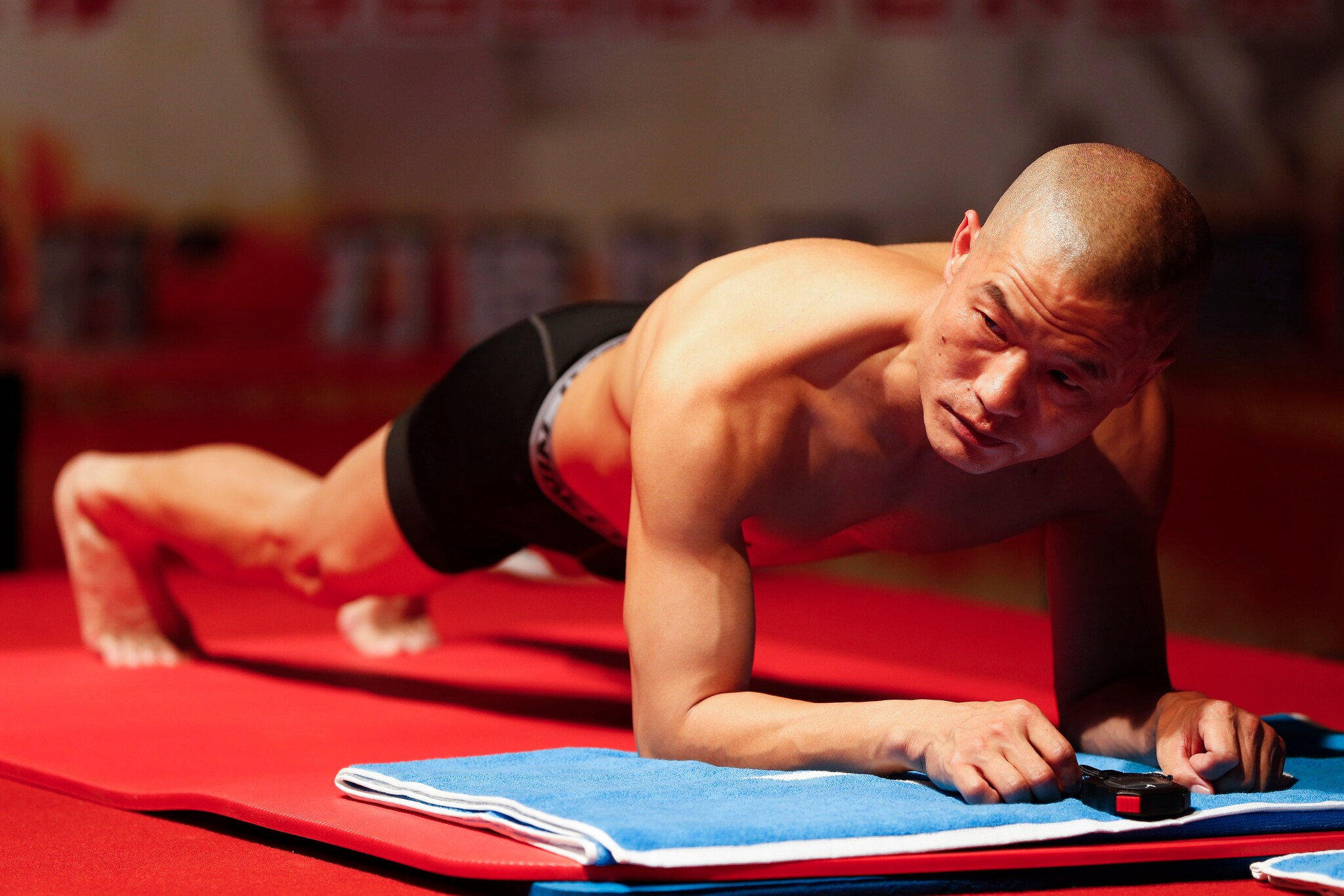 Per quattro ore e 26 minuti Mao Weidong, l'agente della Swat di Pechino, è rimasto fermo sui gomiti contraendo gli addominali e ggiudicandosi il record mondiale.