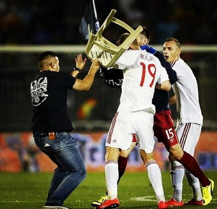 Serbia-Albania era iniziata non nei migliori auspici. Una partita ad altissimo rischio, tanto che era stata vietata ai tifosi ospiti, che è stata sospesa dopo che un calciatore serbo ha "abbattuto" un drone che sorvolava il campo, con una bandiera di rivendicazione di autonomia albanese attaccata. Calci e pugni tra i calciatori in campo: dopo volano anche sedie sul terreno di gioco. Scendono pure gli ultras serbi tra cui il famigerato Ivan Bogdanov.