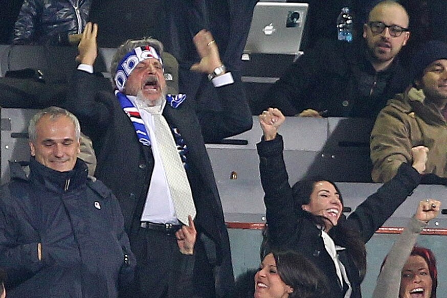La sciarpa della Samp fascia la testa e quasi gli cade sugli occhi ma il presidente Ferrero ne fa una sorta di amuleto per tutta la partita col Napoli. Al punto che, dopo il gol di Eder, il dubbio è legittimo: ma sarà riuscito a vedere il tiro e la rete?
