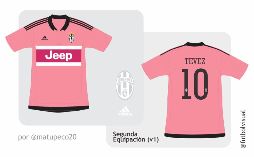 Un bozzetto circolato sul Web per opera di @futbolvisual ha alimentato la curiosità dei tifosi della Juventus. Si tratta del modello relativo alla seconda maglia dei bianconeri che verrà prodotta dall'Adidas: rosa è il colore prevalente che si abbina al nero scelto per tratteggiare colletto, bordi delle maniche e margine inferiore della divisa. Il design della livrea presenta due fantasie sulla parte anteriore: righe orizzontali con alternanza di bianco e rosa shocking.
