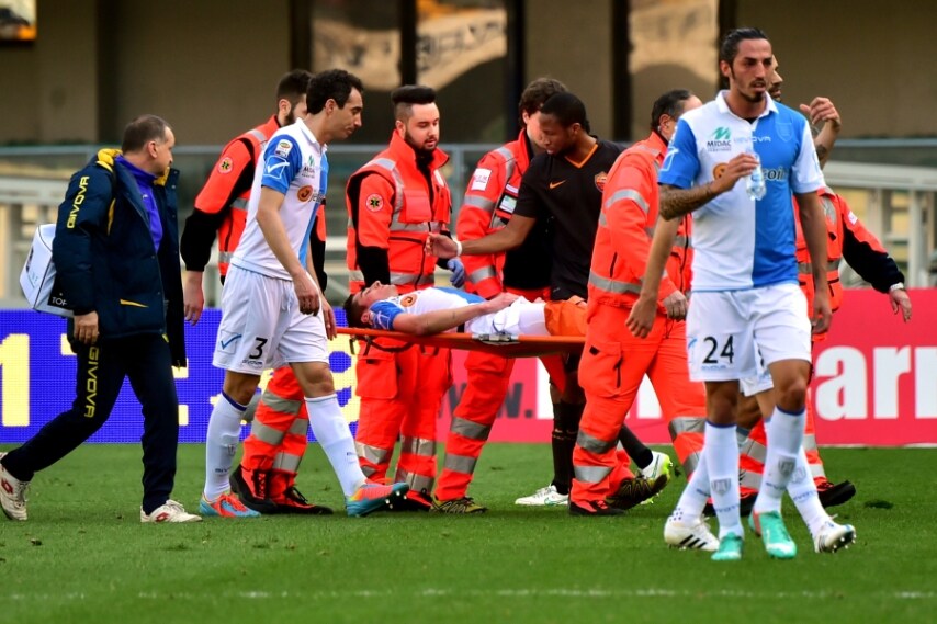 Federico Mattiello, 19 anni, ha subito la frattura di tibia e perone in seguito a uno scontro di gioco con Nainggolan. Infortunio capitato al 15' della gara di campionato tra Chievo Verona e Roma.