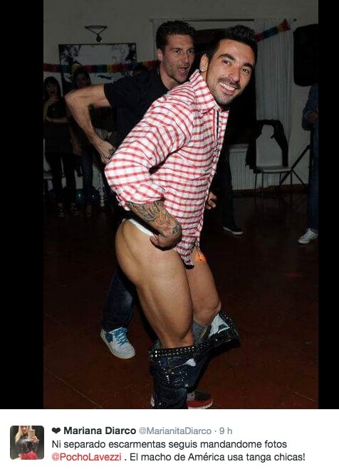 Hanno fatto in breve tempo il giro del sudamerica le foto pubblicate dalla bellissima Mariana Diarco, sul suo profilo Twitter. Le immagini mostrano Ezequiel Lavezzi con i pantaloni abbassati e tanga, durante una festa privata ai tempi di Napoli.