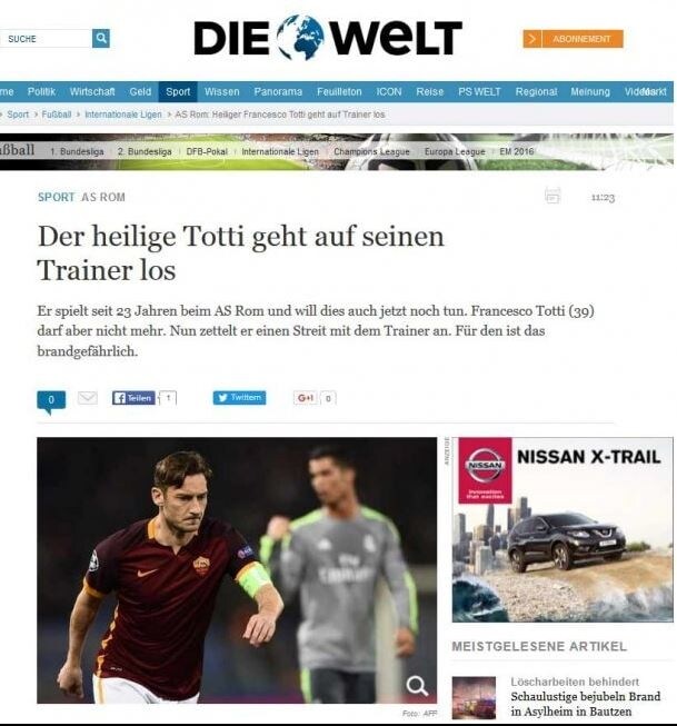 La rottura tra Totti e Spalletti ha fatto il giro del mondo, a parlarne sono anche i massimi giornali sportivi dagli spagnoli (As, Marca, Mundo Deportivo) fino ai tabloid (Mirror).