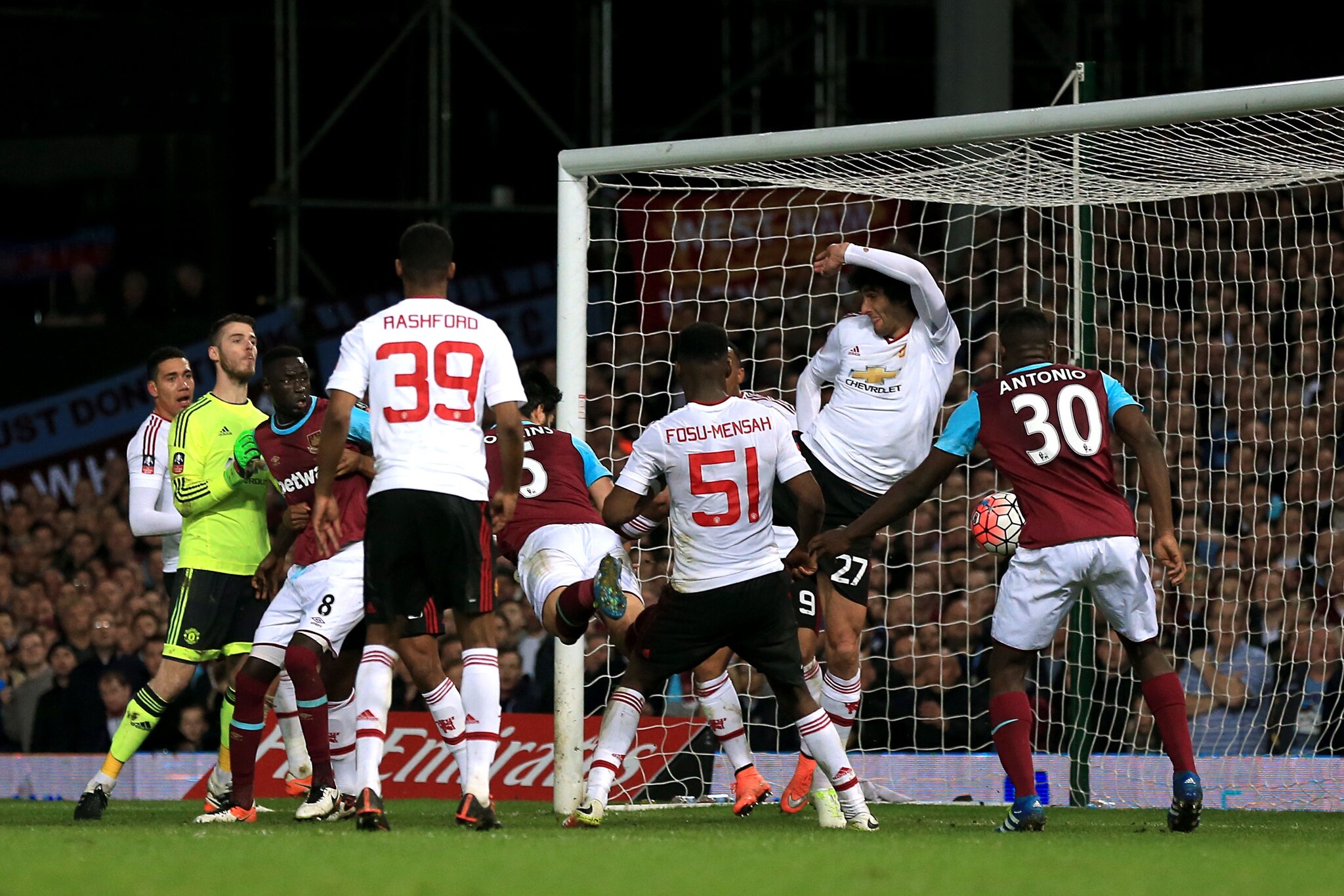 Red Devils che vincono il replay e volano in semifinale contro il Watford: a segno Fellaini e Rashford, per gli Hammers accorcia Tomkins.
