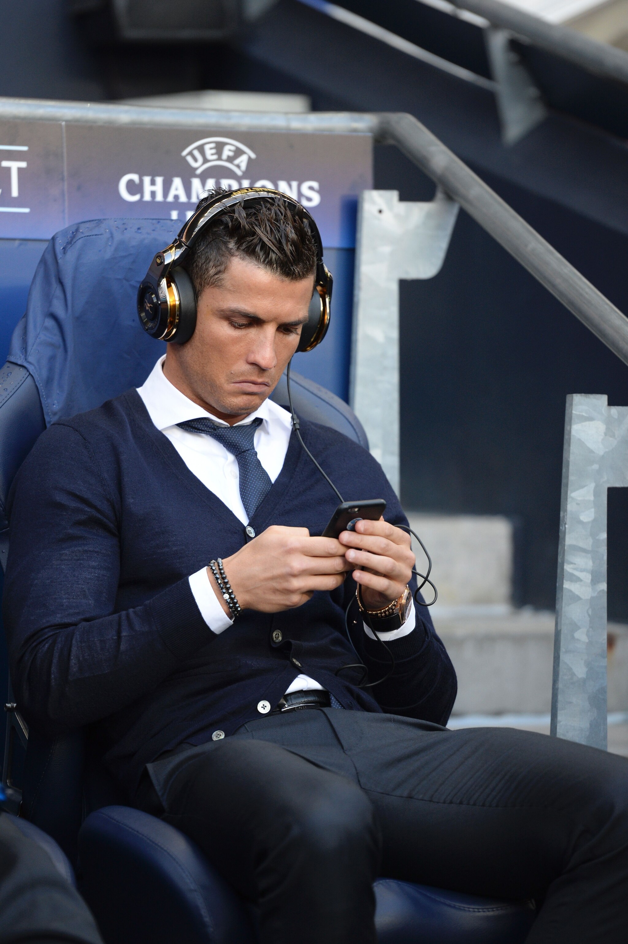 CR7 è stato il grande assente nella semifinale di andata di Champions tra Manchester City e Real Madrid. Accomodato in tribuna, è stato beccato a guardare video di se stesso sul telefonino.