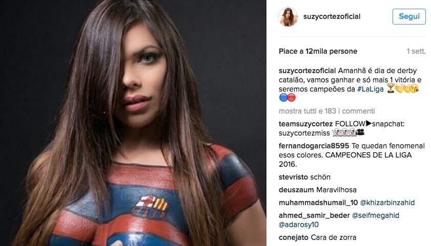 La bellissima modella brasiliana Suzy Cortez, dopo aver postato foto hot su Instagram mostrando tutta la sua ammirazione per Leo Messi (e non solo), ha deciso di fare un regalo ad un altro suo mito, ovvero Gerard Piqué. La procace Miss Bum Bum 2015 ha voluto festeggiare così il titolo vinto dal Barcellona.