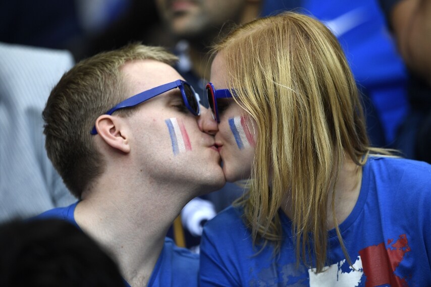 Anche un bacio tra due ragazze prima dell'inizio della sfida tra Germania e Polonia. L'amore che trionfa a Euro 2016 sugli spalti degli stadi francesi: coppie più o meno giovani che si scambiano amorevoli effusioni durante le partite degli Europei.