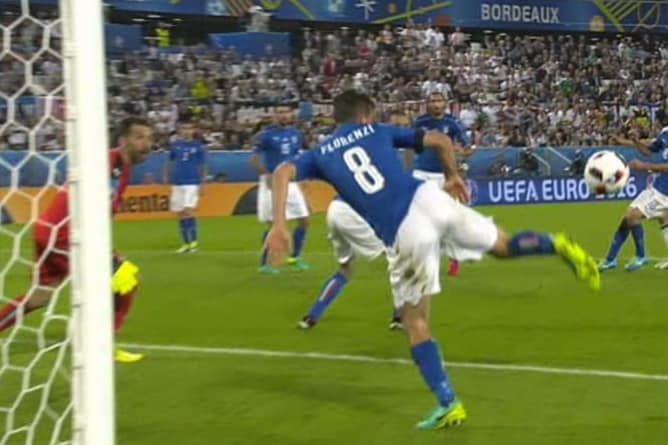 Un colpo di tacco sul tiro di Muller. E' così che Florenzi salva in extremis la porta dell'Italia dal tiro dell'attaccante del Bayern Monaco. E' la prima vera occasione da rete della Germania.