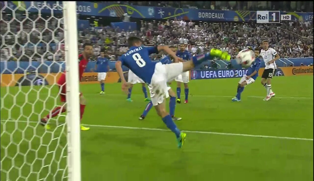 Un colpo di tacco sul tiro di Muller. E' così che Florenzi salva in extremis la porta dell'Italia dal tiro dell'attaccante del Bayern Monaco. E' la prima vera occasione da rete della Germania.