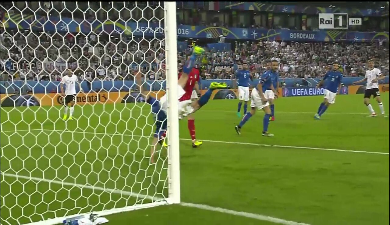 Un colpo di tacco sul tiro di Muller. E' così che Florenzi salva in extremis la porta dell'Italia dal tiro dell'attaccante del Bayern Monaco. E' la prima vera occasione da rete della Germania.
