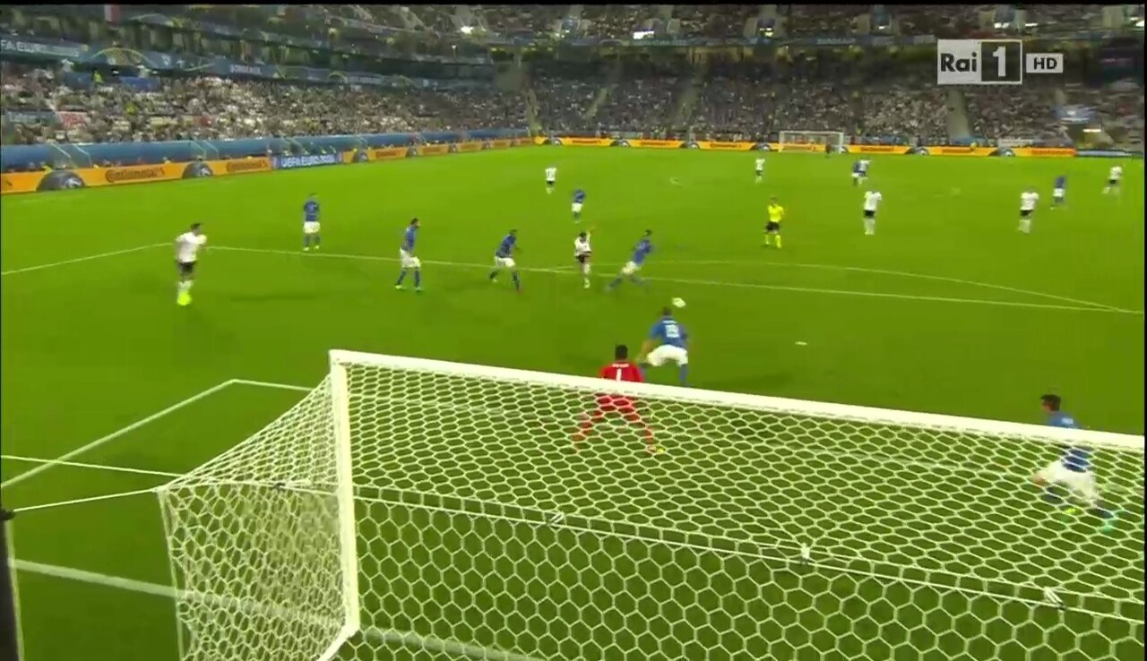 Un colpo di tacco sul tiro di Muller. E' così che Florenzi salva in extremis la porta dell'Italia dal tiro dell'attaccante del Bayern Monaco. E' la prima vera occasione da rete della Germania.