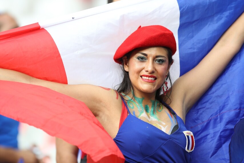 Prima del fischio d'inizio tra Francia e Portogallo, finale di Euro 2016, una tifosa dei transalpini "scalda" lo stadio con baci, saluti e pose "sensuali".