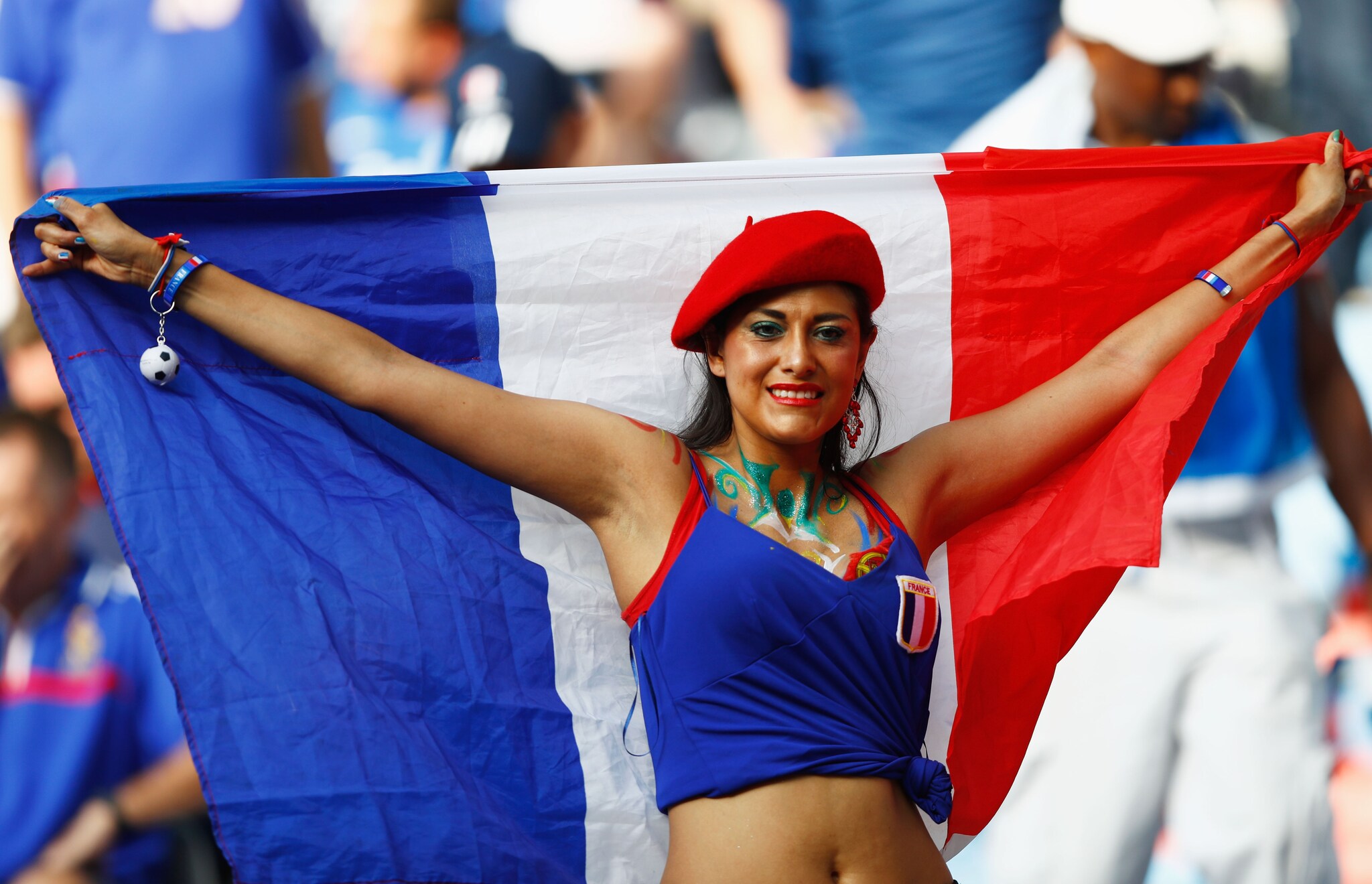 Prima del fischio d'inizio tra Francia e Portogallo, finale di Euro 2016, una tifosa dei transalpini "scalda" lo stadio con baci, saluti e pose "sensuali".