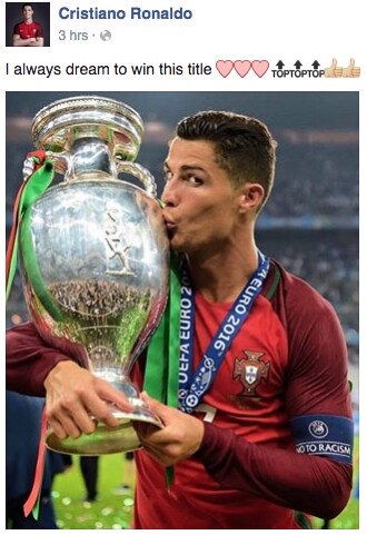 Dopo la straordinaria e per certi versi inattesa vittoria dell'Europeo, Cristiano Ronaldo festeggia con i compagni sull'aereo per il ritorno a casa.