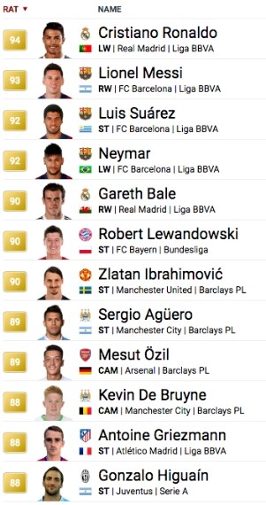 Soltanto Gonzalo Higuain, peraltro in ultima posizione, fa parte della Top Ten dei migliori attaccanti di FIFA 17. A guidare la speciale classifica Cristiano Ronaldo seguito del tridentazo del Barcellona con Messi, Suarez e Neymar.