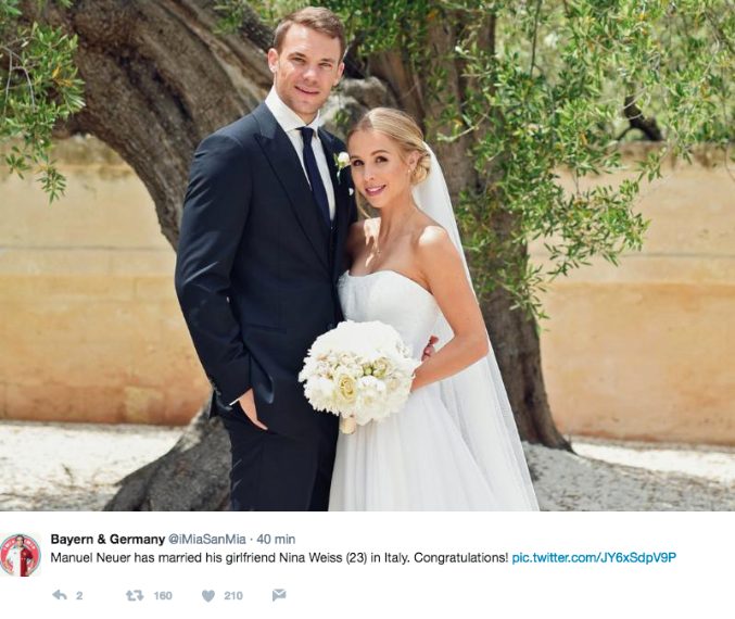 Nina Weiss è la dolce metà di Manuel Neuer, il portiere della nazionale tedesca e del Bayern Monaco. I due, fidanzati da tempo, hanno deciso di celebrare le nozze in Italia: in Puglia, nella città di Martina Franca (in provincia di Taranto).