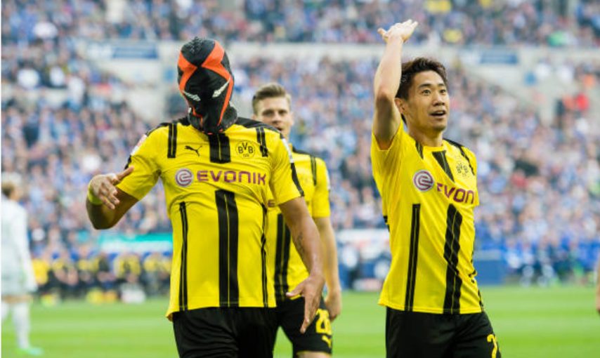 L'attaccante del Gabon celebra il 24° gol in campionato con una maschera ad hoc del suo sponsor, ma fa arrabbiare il Borussia Dortmund.