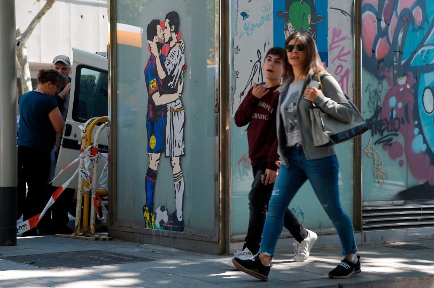 L’artista TvBoy ha raffigurato la stella del Barcellona e quella del Real Madrid in un bacio appassionato sul Passeo de Gracia, una delle strade principali di Barcellona.