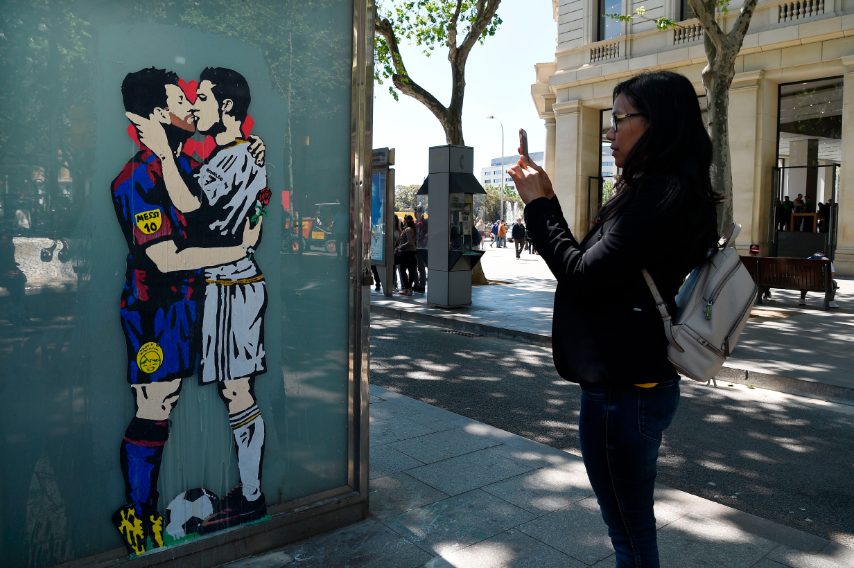 L’artista TvBoy ha raffigurato la stella del Barcellona e quella del Real Madrid in un bacio appassionato sul Passeo de Gracia, una delle strade principali di Barcellona.