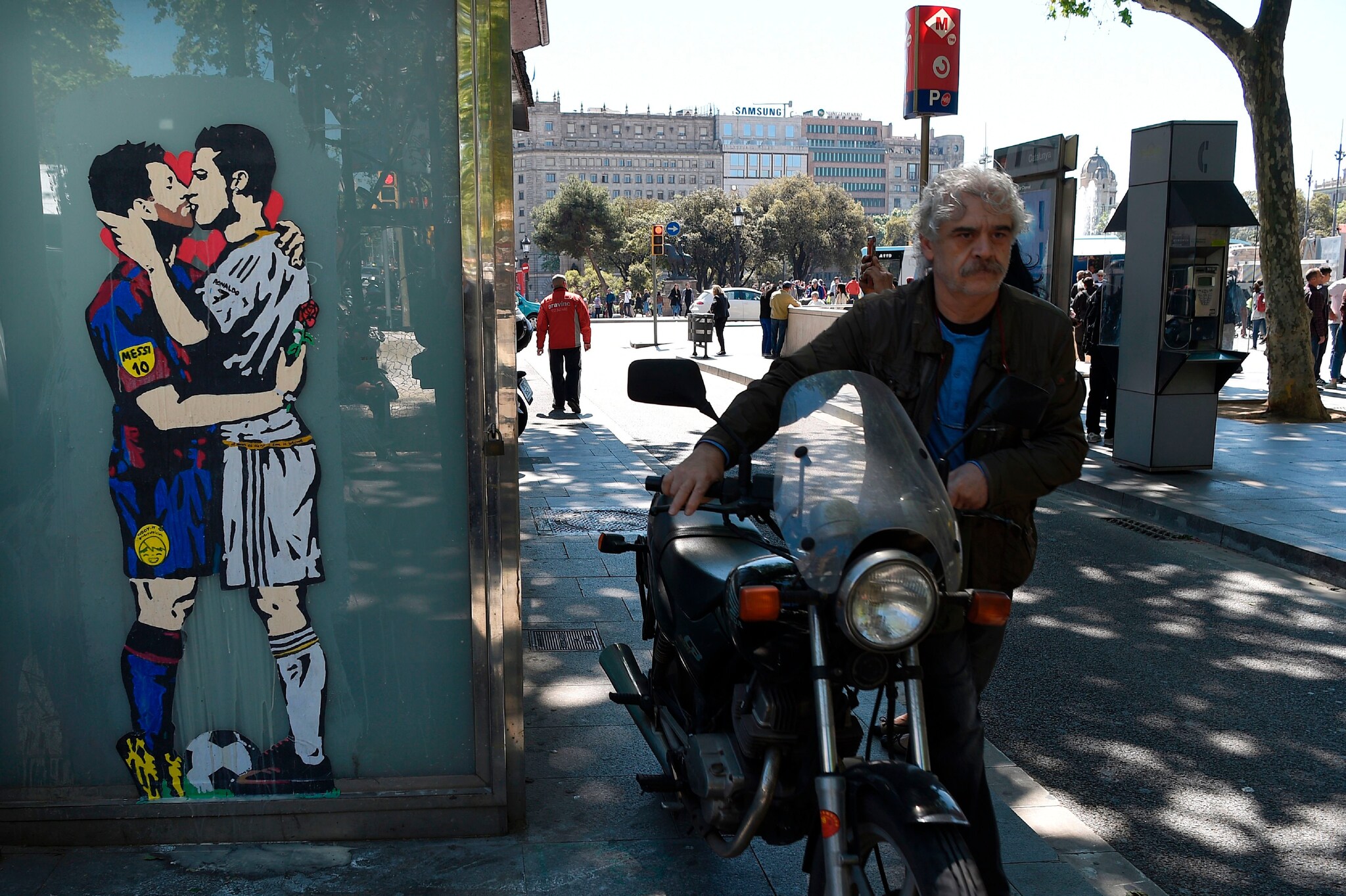 L’artista TvBoy ha raffigurato la stella del Barcellona e quella del Real Madrid in un bacio appassionato sul Passeo de Gracia, una delle strade principali di Barcellona.