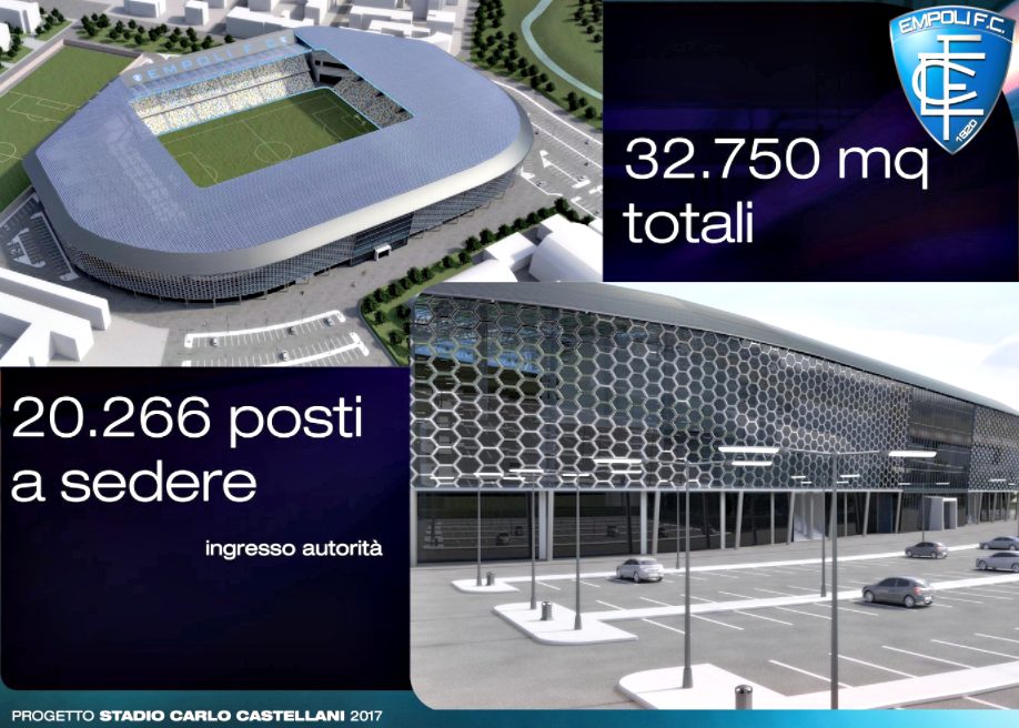 Il nuovo stadio dell'Empoli, che sorgerà sulle ceneri del vecchio 'Castellani', è realtà con la presentazione in Comune del progetto che dovrebbe portare alla costruzione entro il 2020 dell'impianto. Avrà una capienza aumentata a 20.266 posti a sedere, tutti al coperto, e comprenderà anche aree commerciali, ristoranti e un centro medico. (immagini tratte da Twitter, fonte @EmpoliCalcio)