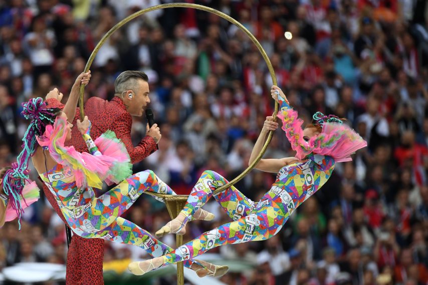 Prima di Russia-Arabia Saudita, gara inaugurale del Mondiale 2018,  c'è stata breve ma molto intensa cerimonia d'apertura. Protagonisti il cantante inglese Robbie Williams, la bravissima soprano russa Aida Garifullina e gli ex calciatori Ronaldo, il 'Fenomeno', e Iker Casillas.