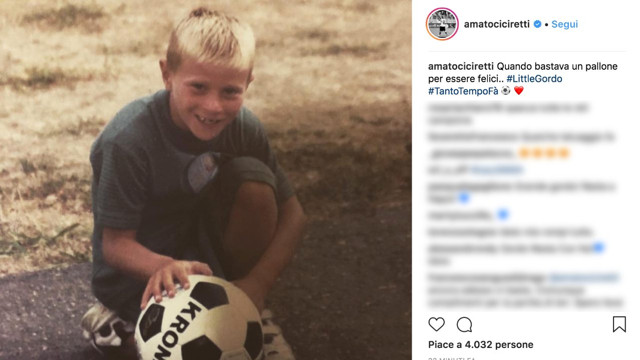 Amato Ciciretti ha pubblicato su Instagram la foto di quando era bambino, accompagnando lo scatto con parole nostalgiche: "Quando bastava un pallone per essere felici". Molti tifosi si sono scatenati nei commenti, alcuni scherzando sulla quantità di tatuaggi comparsa nel tempo.