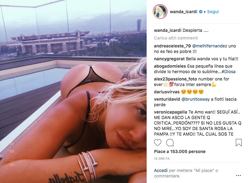 Felice, sveglia, a riposo sognando. Dammi tre parole... sole, cuore, amore. Wanda Nara, moglie e agente di Mauro Icardi - attaccante e capitano dell'Inter - posta sul proprio profilo Instagram tre foto molto particolari che la immortalano in tutta la sua prorompente bellezza. 'Lato b' in vista e sullo sfondo lo stadio di San Siro, un'immagine hot che ha infiammato i tifosi nerazzurri e i followers dell'argentina, volto della nuova stagione del programma Mediaset di Tiki Taka.