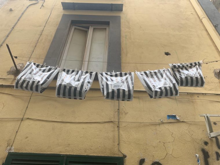 L'ironia napoletana: "Sacchetta juventina" stesa sui fili dei panni