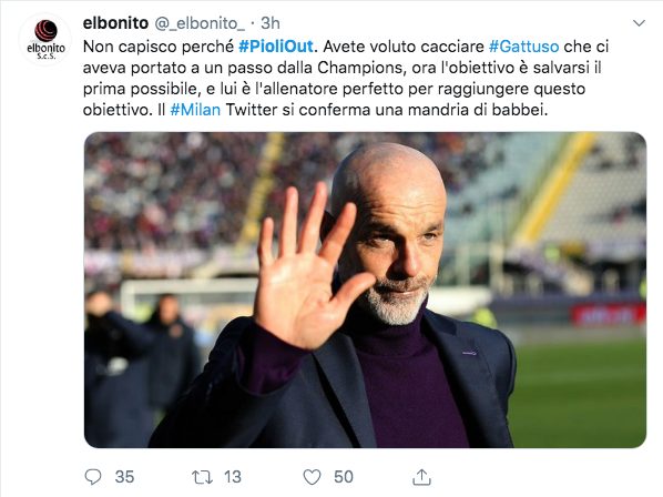 #Pioliout è l'hashtag di protesta dei tifosi del Milan che hanno contestato così la decisione della società di ingaggiare Stefano Pioli al posto dell'esonero Marco Giampaolo.