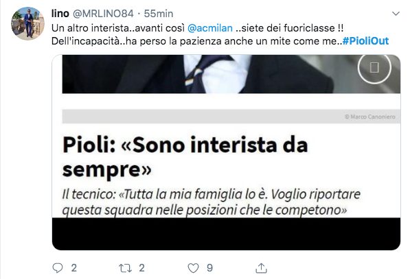 #Pioliout è l'hashtag di protesta dei tifosi del Milan che hanno contestato così la decisione della società di ingaggiare Stefano Pioli al posto dell'esonero Marco Giampaolo.