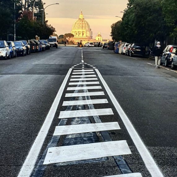 Una delle vedute più celebri della Capitale con un gioco di visuale e prospettiva particolare: dal fondo della strada la cupola della Chiesa di San Pietro appare piuttosto grande, più ci si avvicina alla ringhiera che c'è alla fine della strada e più la cupola tende a rimpicciolirsi agli occhi