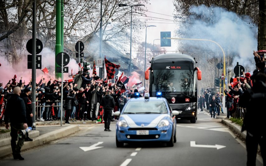 Assembramenti davanti allo stadio di San Siro dei tifosi di Milan e Inter. Addirittura i pullman delle due squadre vengono bloccati dalla marea di persone; poi gli agenti si schierano in assetto antisommossa.