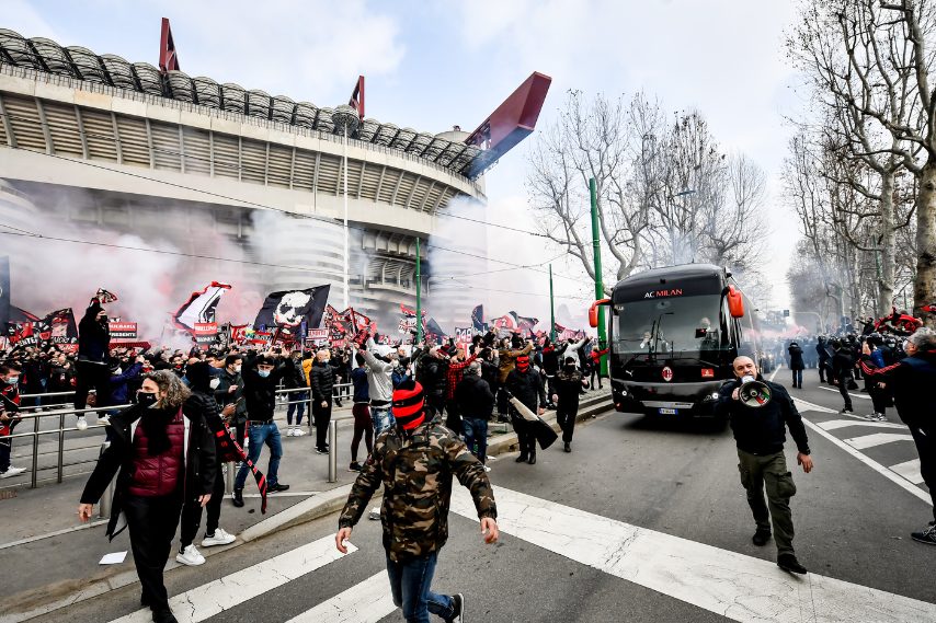 Assembramenti davanti allo stadio di San Siro dei tifosi di Milan e Inter. Addirittura i pullman delle due squadre vengono bloccati dalla marea di persone; poi gli agenti si schierano in assetto antisommossa.