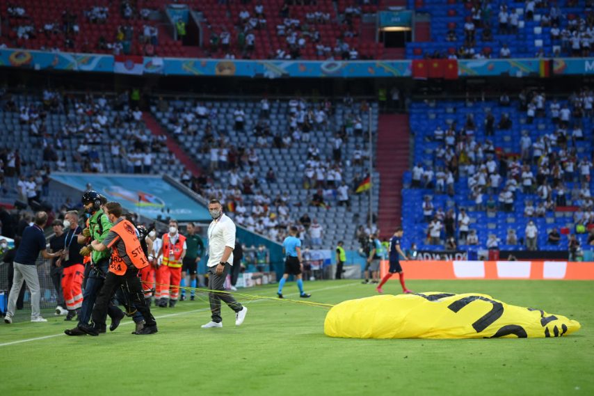 Fuori programma allo stadio Allianz Arena prima del fischio d'inizio del match degli Europei tra Francia e Germania. Attivista di Greenpeace ha deciso di fare irruzione in campo dal cielo