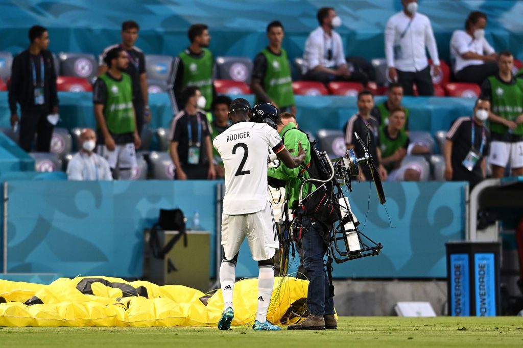 Fuori programma allo stadio Allianz Arena prima del fischio d'inizio del match degli Europei tra Francia e Germania. Attivista di Greenpeace ha deciso di fare irruzione in campo dal cielo