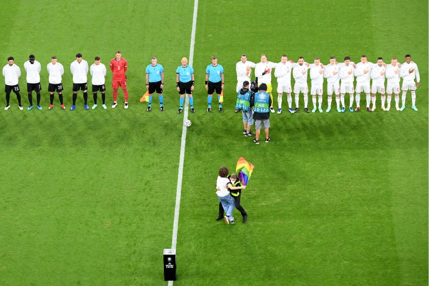Irruzione pacifica in campo di un ragazzo che mostra la bandiera arcobaleno davanti alle nazionali schierate. Il tutto avviene dopo le polemiche che alimentato il dibattito in questi giorni sulla decisione della Uefa di vietare che l'Allianz Arena si illuminasse con i colori della bandiera arcobaleno.