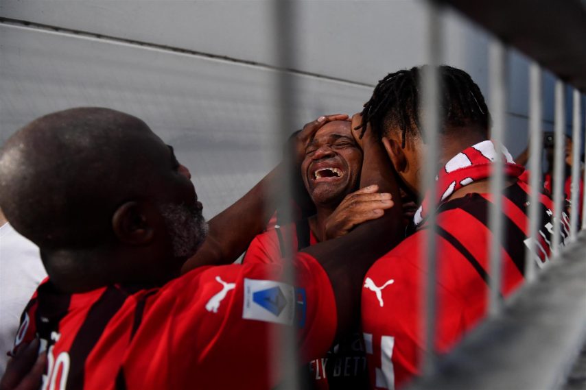 Rafael Leao si lascia andare alle lacrime dopo aver vinto lo scudetto con il Milan, abbracciato dai suoi compagni di squadra. L'attaccante portoghese è stato eletto MVP del campionato di serie A.