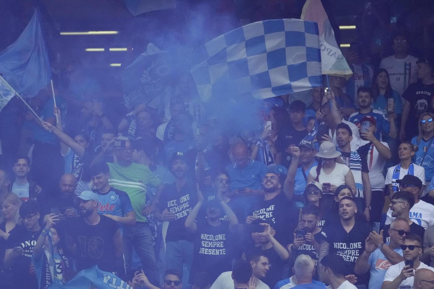 Il popolo partenopeo si è riunito al "Maradona" in occasione dell'ultima partita di Serie A, per dare il via alla festa di uno scudetto oramai celebrato da un mese. Enorme entusiasmo e partecipazione sugli spalti, ad applaudire giocatori, tecnico e club in un tripudio azzurro.