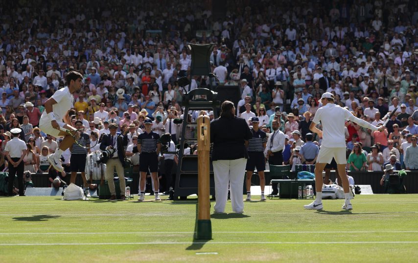 Jannik Sinner è in campo contro Carlos Alcaraz nella finale del torneo di Wimbledon. Numero 1 contro numero 2 per il titolo dei Championships.