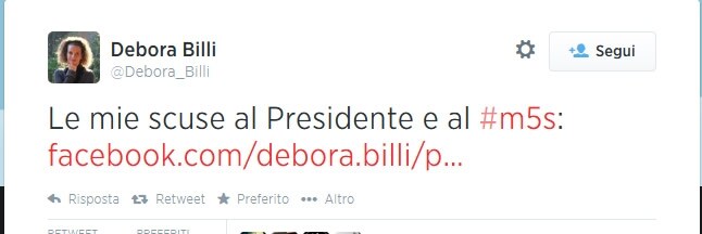 Polemiche dopo il messaggio lanciato sui social da Debora Billi che si definisce risposabile web del M5S per Montecitorio. Dopo le critiche la stessa Billi in un successivo commento si è scusata parlando di battuta infelice.