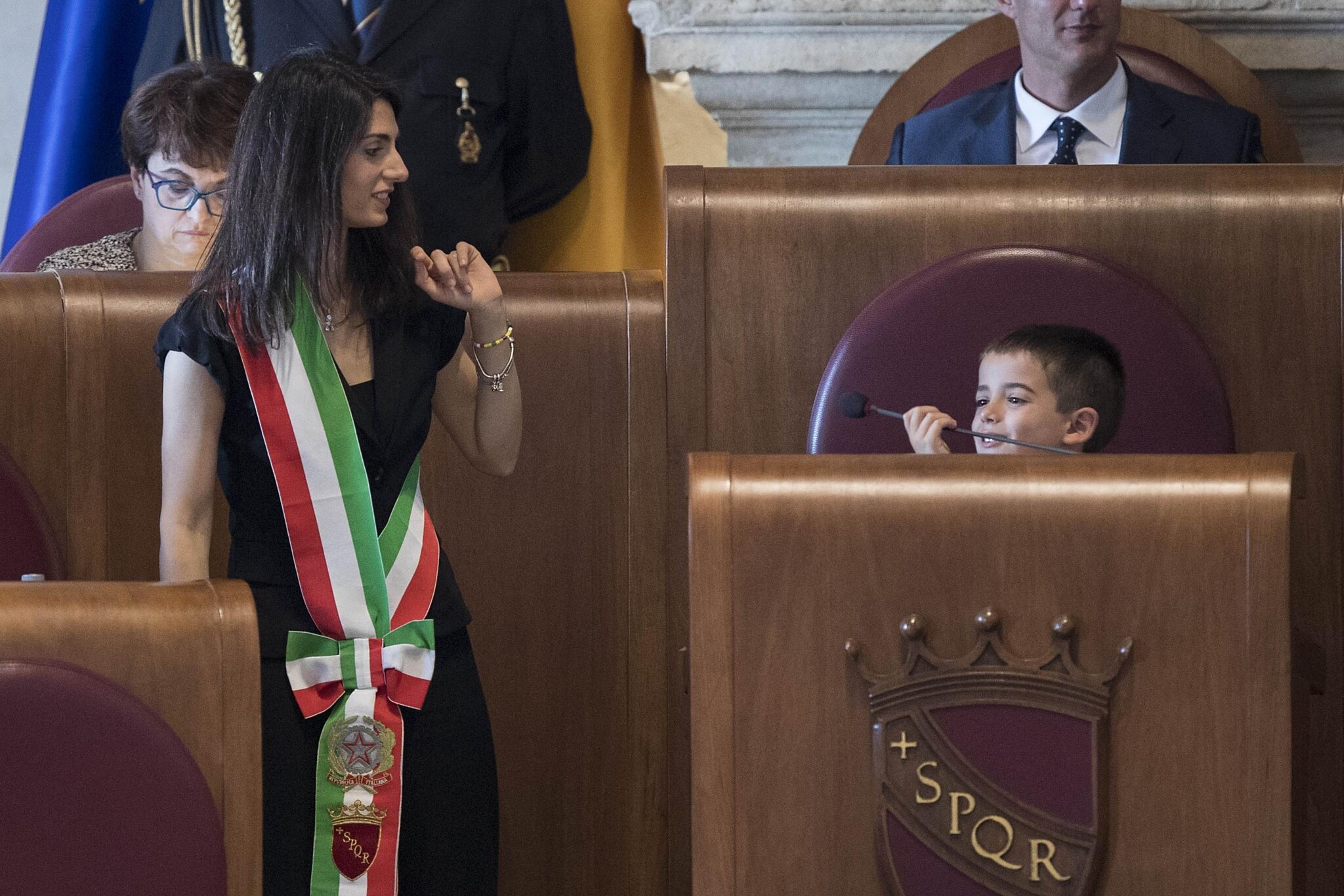 Fuori programma in Campidoglio nel corso del primo consiglio comunale di Roma dopo la vittoria di Virginia Raggi alle elezioni. La neo sindaca ha fatto sedere suo figlio sullo scranno riservato al sindaco dell'Aula Giulio Cesare.