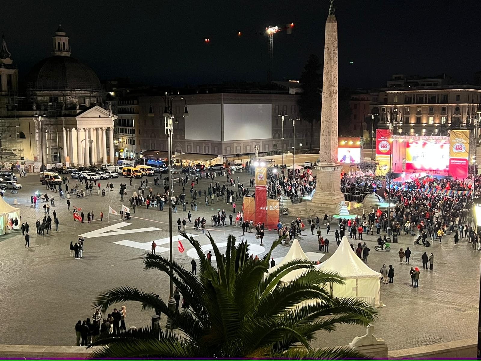 Piazza semivuota all'evento finale della campagna per il No al Referendum per la riforma della giustizia organizzato in Piazza del Popolo a Roma. Le foto della piazza dopo le 19, quando sono iniziati gli eventi dei leader politici come Conte e Schlein, mostrano poche persone ammassate solo sotto il palco