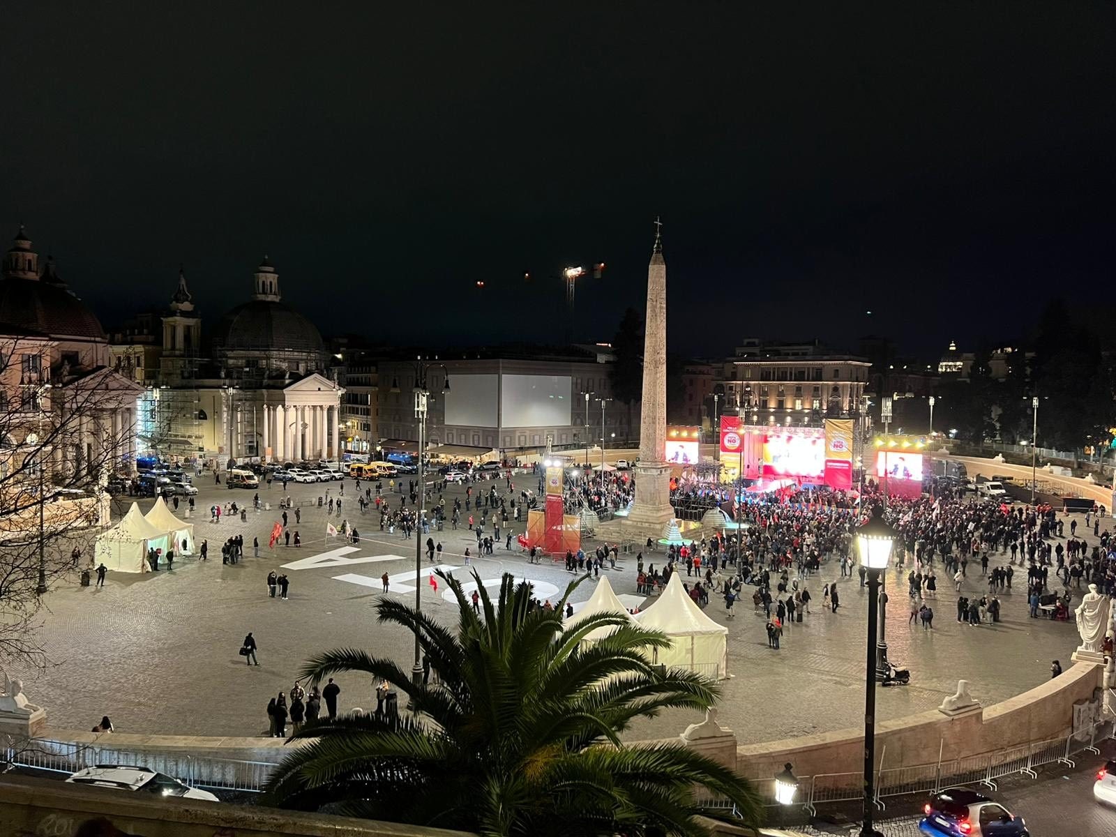 Piazza semivuota all'evento finale della campagna per il No al Referendum per la riforma della giustizia organizzato in Piazza del Popolo a Roma. Le foto della piazza dopo le 19, quando sono iniziati gli eventi dei leader politici come Conte e Schlein, mostrano poche persone ammassate solo sotto il palco