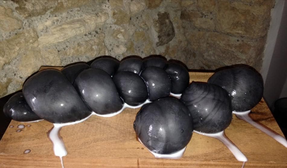 La mozzarella di bufala nera, prodotta col carbone vegetale è uno dei prodotti più ricercati degli ultimi tempi. È realizzata nella Piana del Sele (Salerno). / Foto caseificio Ilka