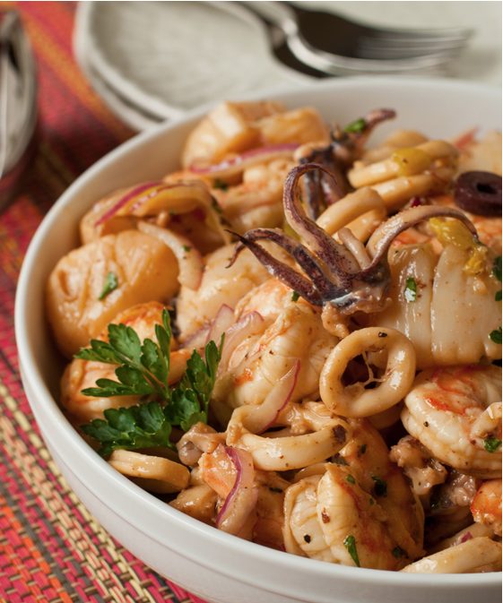 Insalata squisita con calamari, polipo e frutti di mare. Fonte: