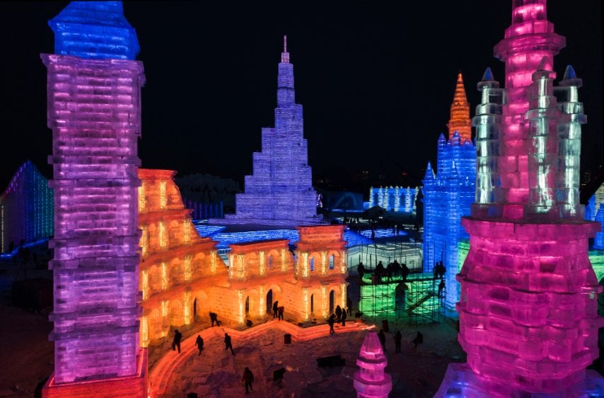 Siamo ad Harbin, in Cina, dove da diversi anni ormai si tiene un importante Festival dedicato al ghiaccio. Dal 1984 una vera città di ghiaccio prendere forma, con palazzi, ponti ed altri edifici. Il parco a tema è grande 600mila metri quadrati e ospita anche delle competizioni di scultura del ghiaccio che richiamano artisti da tutto il mondo