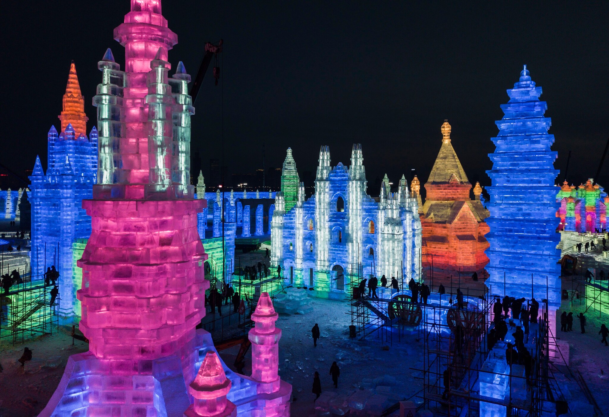 Siamo ad Harbin, in Cina, dove da diversi anni ormai si tiene un importante Festival dedicato al ghiaccio. Dal 1984 una vera città di ghiaccio prendere forma, con palazzi, ponti ed altri edifici. Il parco a tema è grande 600mila metri quadrati e ospita anche delle competizioni di scultura del ghiaccio che richiamano artisti da tutto il mondo